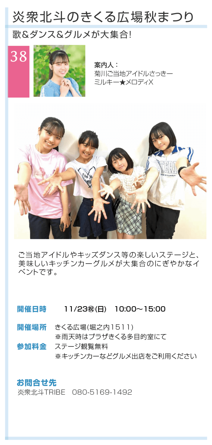 ご当地アイドルやキッズダンス等の楽しいステージと、美味しいキッチンカーグルメが大集合のにぎやかなイベントです。